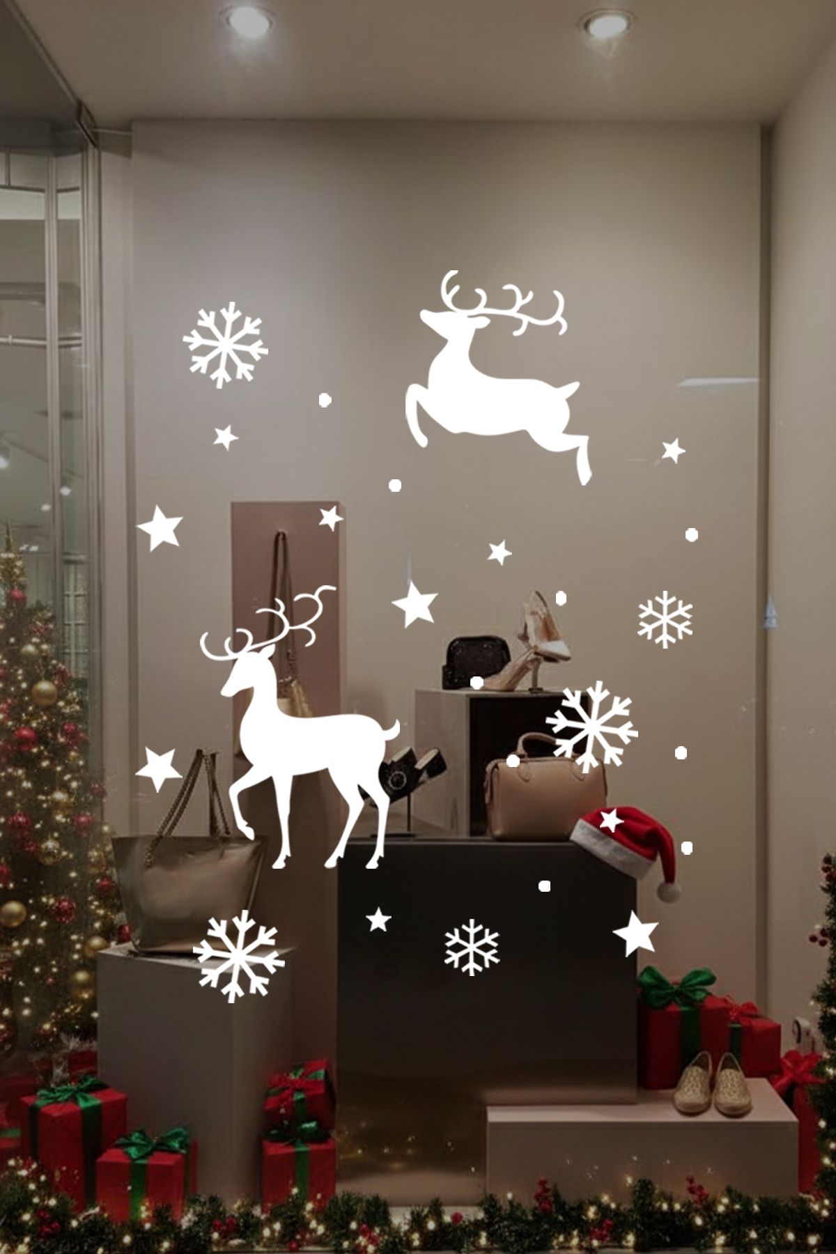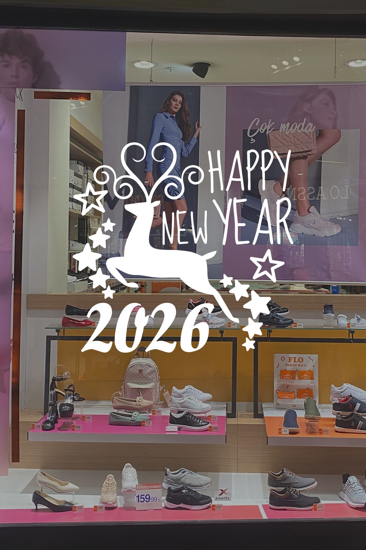 Geyik ve Happy New Year 2026 Yılbaşı Vitrin Cam Sticker