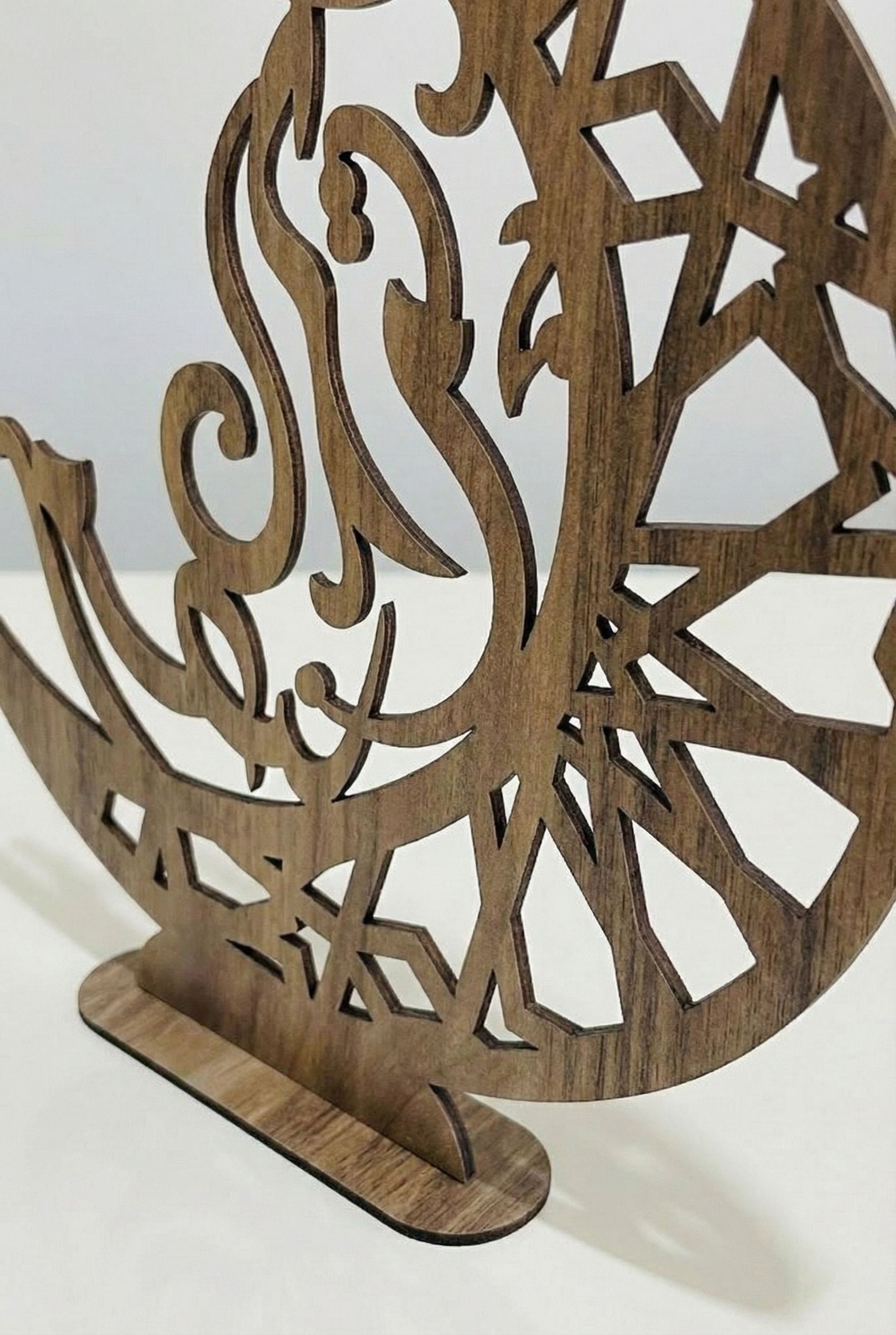 Modern tasarıma sahip bu ahşap süs, geleneksel motiflerle birleşerek hem klasik hem de çağdaş dekorasyon anlayışını yansıtıyor.