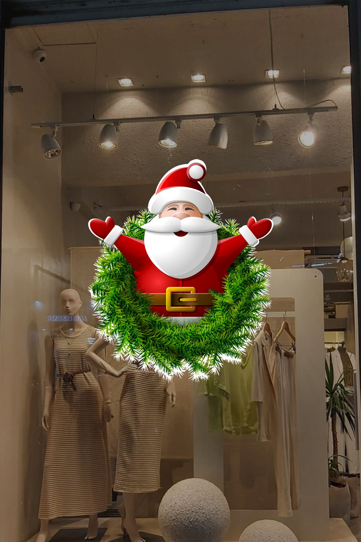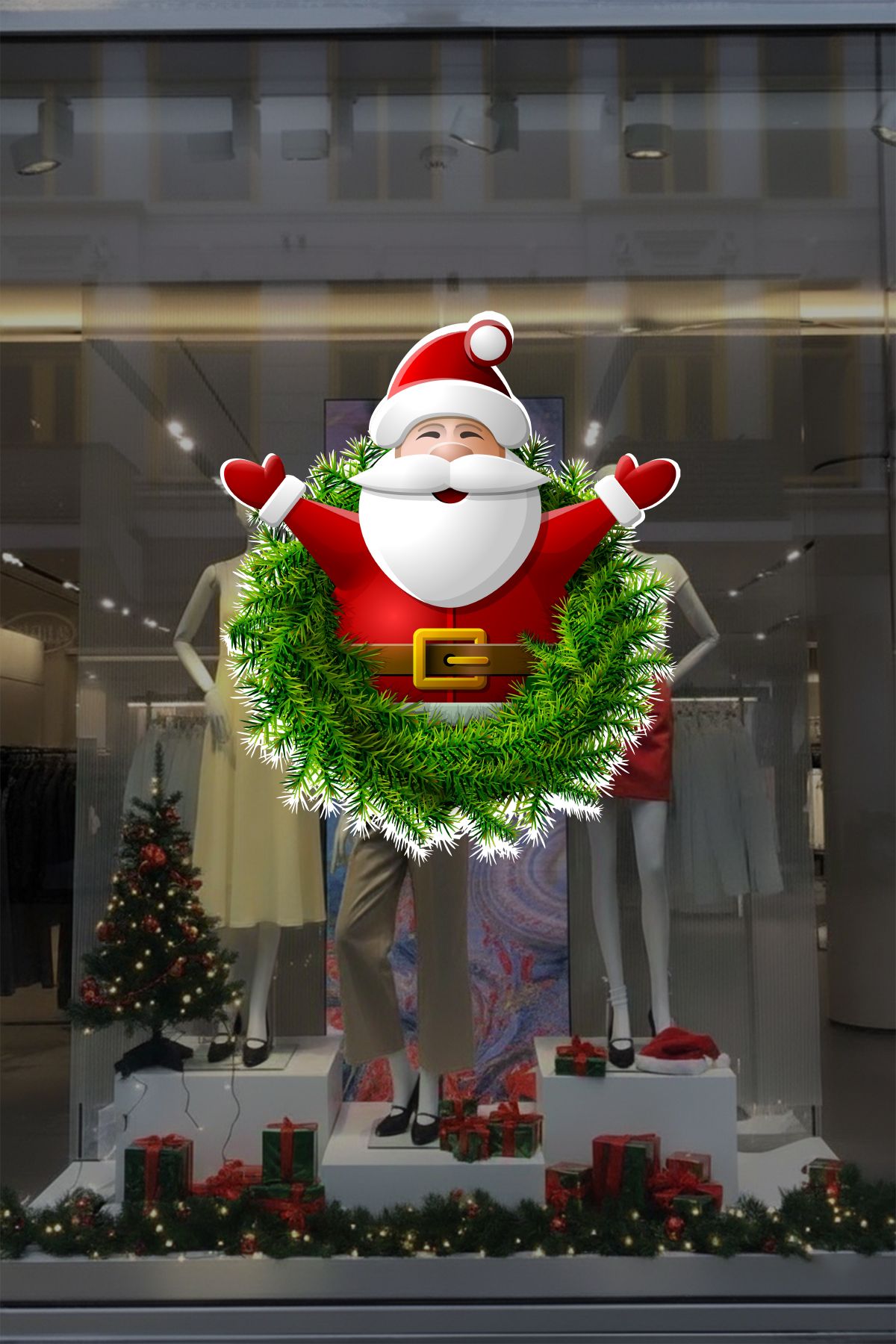 Kırmızı ve yeşilin enerjik uyumu, vitrine anında dikkat çeken parlak ve etkileyici bir yılbaşı havası katar.