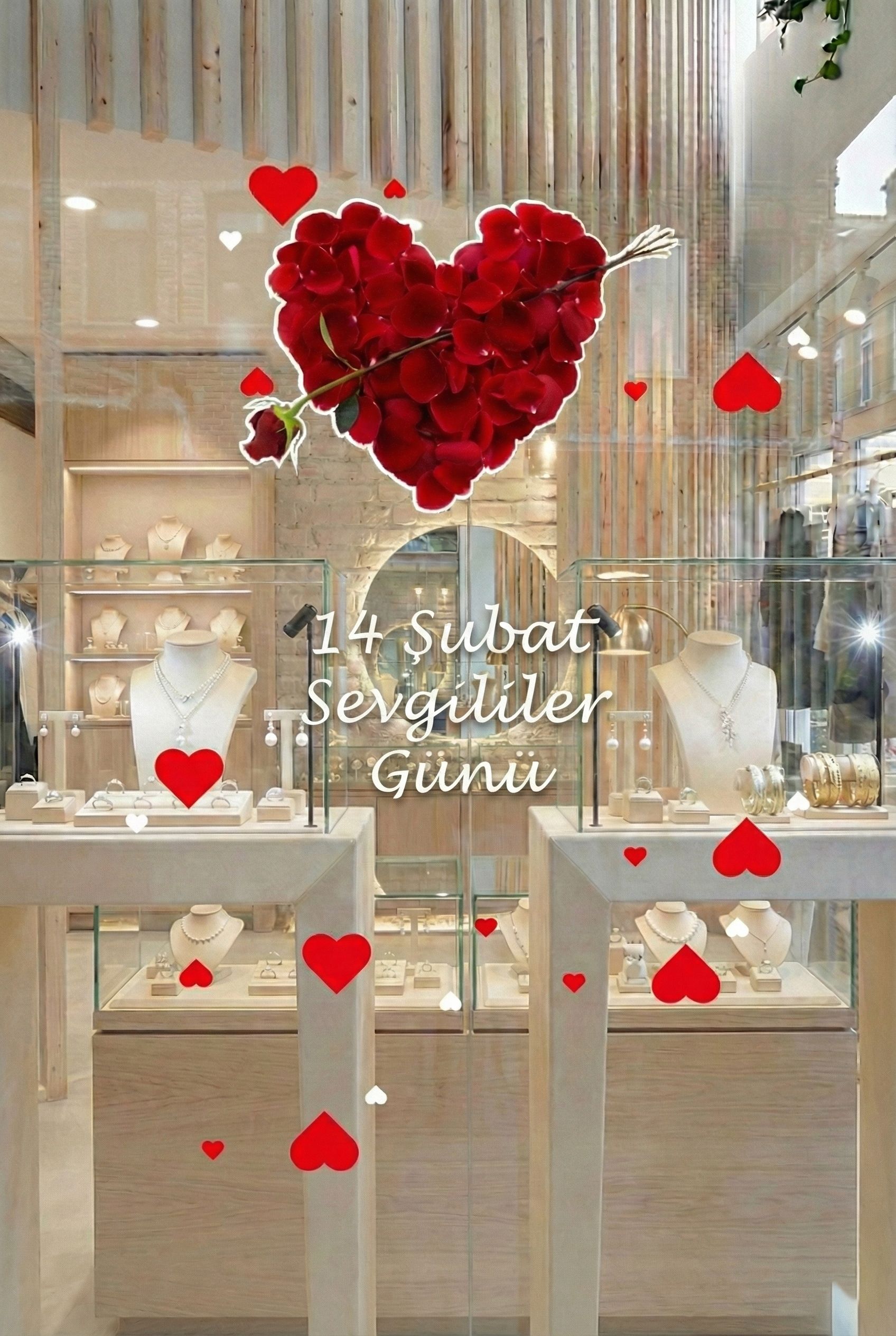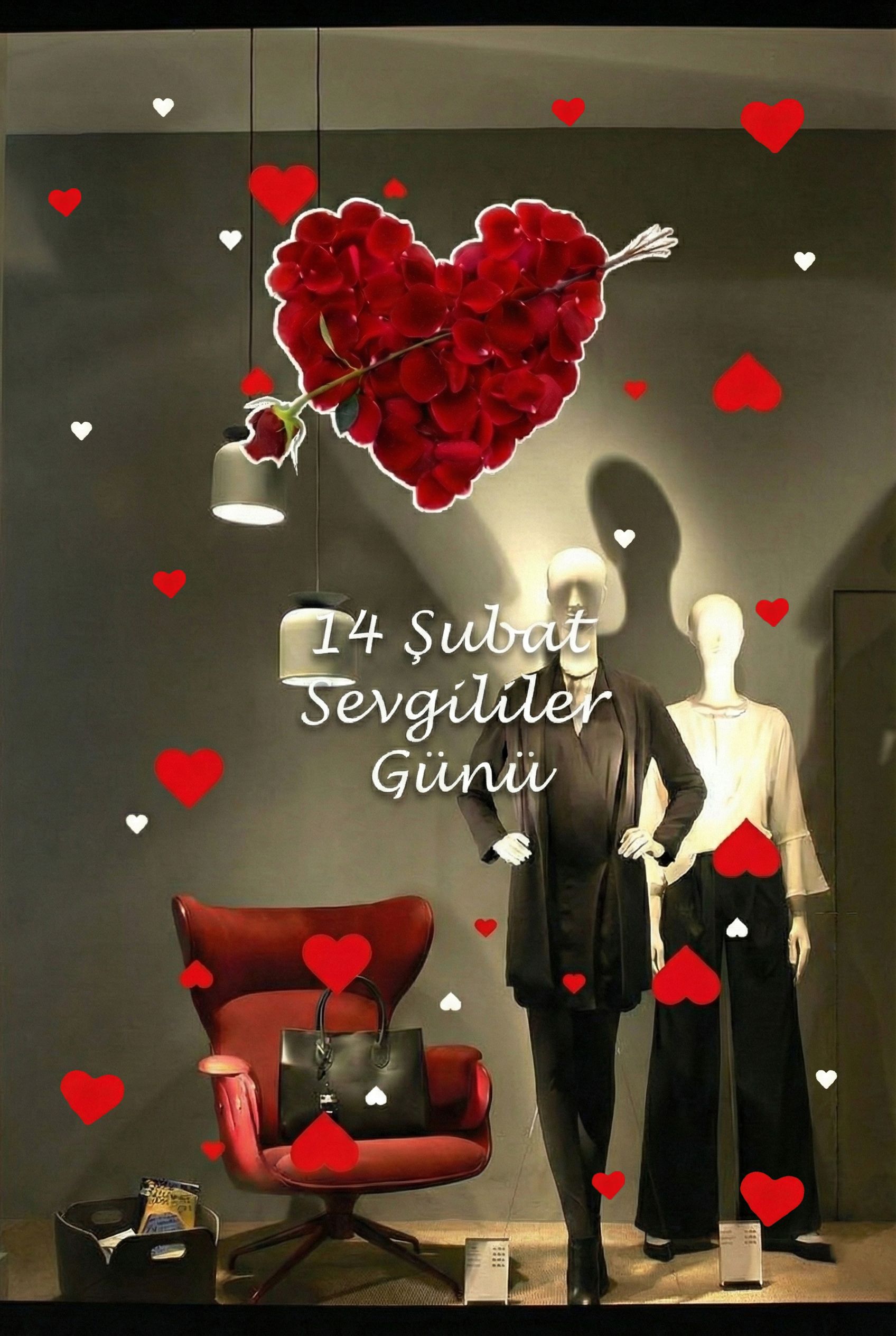 Romantik ve zarif bir vitrin atmosferi sunan bu kalp temalı sticker tasarımı, kırmızı kalp detaylarıyla Sevgililer Günü ruhunu ön plana çıkarır. Mağaza camı, vitrin ve dekorlarda sıcak, duygusal ve dikkat çekici bir görünüm sağlar.