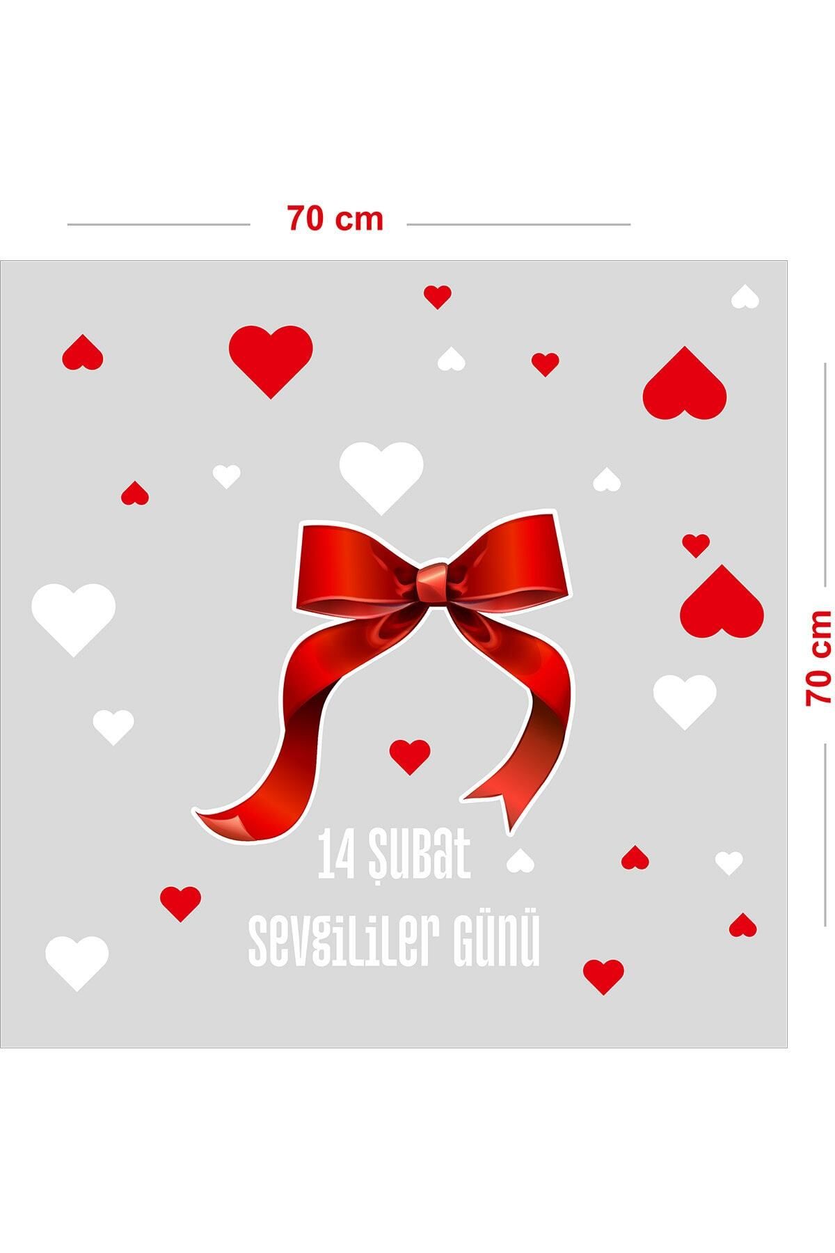 Sevgililer Günü'ne özel Kırmızı Kurdele ve Kalpler temalı cam vitrin oda stickerı, 70 cm boyutu ile evinize ya da iş yerinize romantik bir atmosfer kazandırır. Kendinden yapışkanlı yapısı sayesinde uygulaması son derece kolaydır ve uzun ömürlüdür.