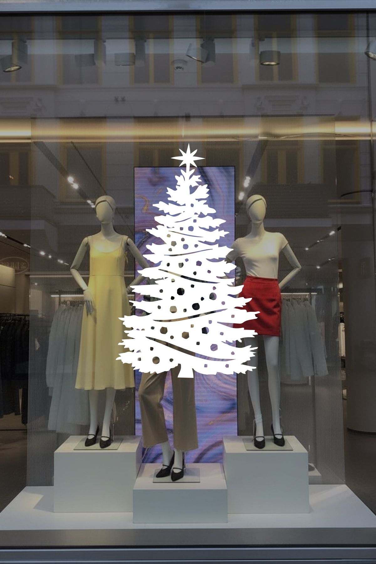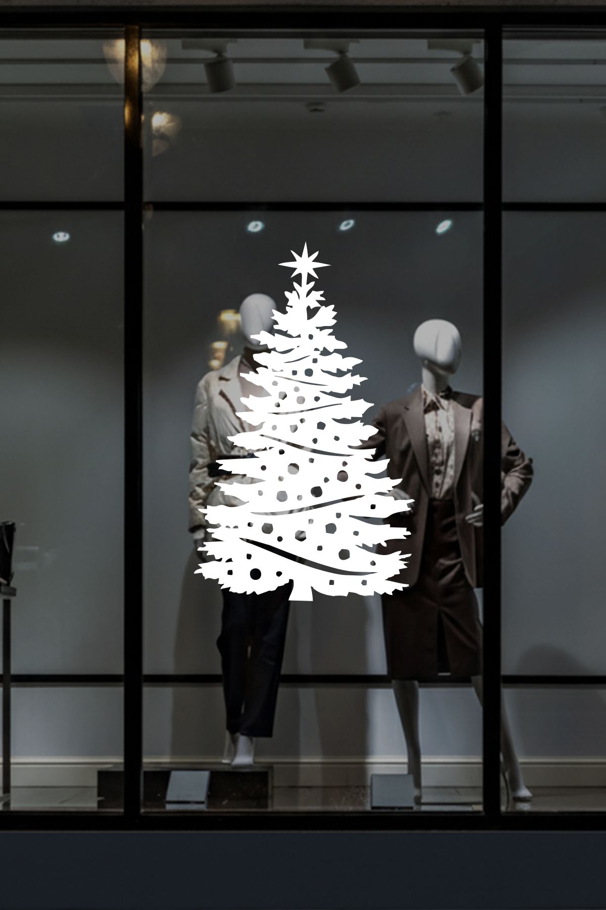 Modern çizgilerle hazırlanmış bu yılbaşı çam ağacı stickerı, vitrinlere temiz ve zarif bir görünüm kazandırır. Minimal detayları sayesinde her ortama uyum sağlar ve etkileyici bir yılbaşı atmosferi oluşturur.